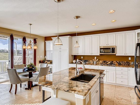 Stunning home with spacious, open floor plan backing to open space with gorgeous mountain views in highly sought after Firelight community. Step into the open foyer and be drawn into the heart of this beautiful home with its tasteful finishes. The formal dining room/living room offers beautiful built-ins and gleaming hard wood flooring. The kitchen is a cook's delight with a large center island, gas stovetop, slab granite countertops and roomy eating space that leads to a deck with views galore..the kitchen opens up into the family room with a cozy gas log fireplace, high ceilings and ample windows to bring in the natural light and amazing views of the open space. The bonus room located off of the family room is a perfect space for your home office. Upstairs you will find the over-sized master bedroom complete with a 5-piece master bath, 2 walk-in closets and a second story deck to relax and enjoy your morning coffee while taking in the breathtaking mountain views. Two additional large bedrooms connected by a large jack-n-jill bath with new tile complete the upper floor. The beautifully finished walk-out basement boasts 2 bedrooms, 3/4 bath, theater/media room and family room perfect for guests. The covered deck/patio off the walk-out basement is sure to provide you with amazing views to entertain guests or simply enjoy and relax. 3-car garage with ample space for storage/tools. Experience the hiking/biking/walking trails and park right outside your door. Walking distance to top-rated schools and access to 4 recreation centers....easy access to DTC, Downtown, DIA, Mountains. Additional features include: Fresh/new interior paint, New tile flooring, New furnace/humidifier, New driveway/pathways, Newer impact-resistant roof, Newer exterior paint. Theater chairs, screen and projector to complete your theater/media room as well as buyer's home warranty are included in sale! This home has it all!