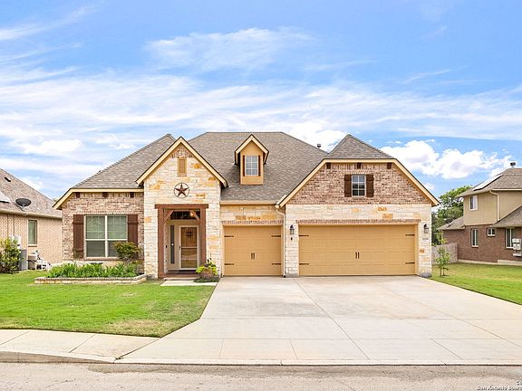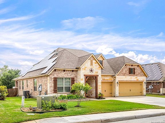 Upon entry to the Triana community you'll notice the feeling of safety, quietness, and a friendly environment! Our property includes solar panels, 3 car garage, water softener, and well manicured landscaping. As you step inside, you'll be greeted by 24-inch tile flooring that sets the tone for the rest of the home. The dining room features a charming chair rail that adds a touch of elegance to your entertaining space. The glass inlay French doors lead to a spacious office that is perfect for working from home. The home's kitchen is truly a chef's dream with double ovens, a massive island and bar seating that make it an ideal space for cooking and entertaining. Between the 2 bedrooms with their own bathrooms there is a tucked flex space to hang out, arrange as a craft zone, fitness area, homework zone or whatever you could imagine. Upstairs, you'll find an extra-large game room with a half bath that is perfect for hosting game nights or movie marathons. The primary bedroom features a spacious walk-in closet, a garden tub and separate shower. If you love to spend time outdoors, you'll appreciate the spacious covered patio and outdoor kitchen with a gas grill, mini fridge, and sink where you can cook up a storm while enjoying the beautiful weather. Take a break from the Texas heat in your sparkling blue pool, or warm up on those cool nights in the attached hot tub (pool is also heated)! Have a bit of competition with your friends on the putting green to see who has the best shot! You'll also find multiple fruit plants in the backyard including blueberries, pomegranates, bananas, cherry, & pear that are sure to delight your taste buds. You have plenty of elbow room between your neighbors and there are maple trees along side that will begin to grow nice natural boundary. This home truly has it all. Easy access to Bandera Rd and 1604 provides the needed convenience to be close to multiple shops, restaurants, and entertainment. Don't miss out on the opportunity to make it yours!