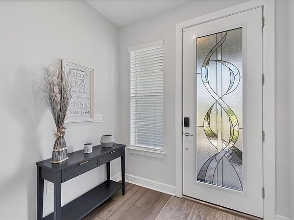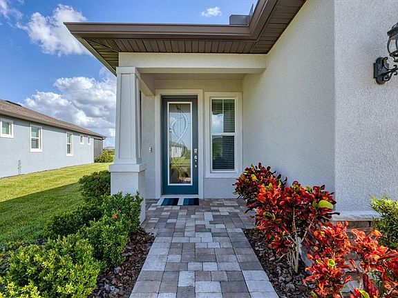 This HALLMARK floorplan home sits on a “worth the wait” water view lot—total bliss from inside the house or the extended screened lanai. Sellers installed a full-view glass insert to the front door, which added a warm welcome to the foyer. Featuring a “chef's” kitchen with a gas stovetop, a separate oven, and a microwave; do note that all appliances convey with the sale (including the refrigerator, Samsung front load washer and dryer with pedestals and the sellers’ favorite water softener). The owner's suite shares the water view, and the Owners’ bath has a generous vanity with dual sinks and a walk-in shower. Storage? The primary closet is beautifully finished and has storage for all your shoes! Your guests will appreciate the privacy offered, including the full bath with tub just outside the bedroom. Located in the center of the highly active community of Del Webb Bay View, a short stroll to the state-of-the-art fitness center, resort pool, and community gardens. Bay View is Golf cart friendly. Clubs and activities galore! You will wonder why you took so long to move here. Located 1.5 miles from I-75, making travel to airports, arts, culture, and beaches easy.
