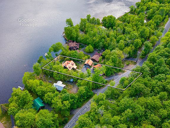 Amazing full-time residence or vacation home! Beautiful custom-built Cape Cape Cod style Adirondack home on private Goodnow Flow Lake. Enjoy 3.5 miles of this peaceful lake nestled by mountain views. HOA includes access to 7700 acres of land for snowmobiling, 4-wheeling, hunting, hiking. Home features wood flooring throughout with open beam ceilings. An open kitchen, dining and living room floor plan with a wood fireplace overlooking the lake off a full screened-in porch. Kitchen has maple countertops and cupboards, island with a vegetable sink and garbage disposal, dishwasher, microwave, refrigerator, gas range and electric oven. Off the living room is a full bath, laundry room and den that can be converted into a bedroom for one floor living. Upstairs has 2 bedrooms, a full bath with skylight and large closet. Primary BR has gas fireplace. Bunkhouse has ceramic tiled first floor, kitchen, microwave, stove, commercial sink and woodstove. Second floor sleeps up to 10 with full bath. Heated workshop, woodshed, 3-sided carport & greenhouse with it's own water source. Owner will be including dock, pontoon boat and Generator. List of contents to remain available upon request.