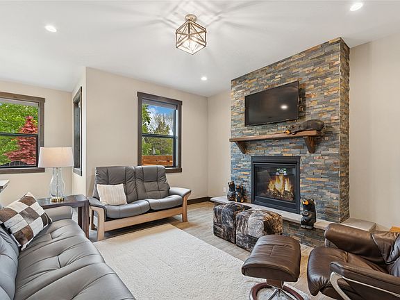 Located minutes from downtown Bigfork, the residence enjoys partial views of Flathead Lake and the convenience of low-maintenance living in an exclusive community. This Mill Creek luxury townhome offers three bedrooms and 2.5 baths with premium finishes throughout. The main level centers on a rock-faced gas fireplace with a timber mantle, adjoining a chef’s kitchen outfitted with antique-white cabinetry, granite countertops, black stainless appliances, including a gas range, and mixed-metal lighting. Wide luxury-vinyl plank flooring and solid Knotty Alder doors and trim provide high-end detail. Upstairs, the vaulted primary suite features a sliding barn door to a spa-style bath with dual granite vanities, a private water closet, and an oversized walk-in closet. Two additional bedrooms share a Jack-and-Jill bath with a separate tub/shower room, double granite vanity, and tiled flooring. A finished, heated two-car garage, central A/C, and fully irrigated landscaping.