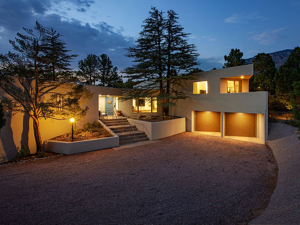 Stunning custom Sandia Heights residence boasts contemporary design and great views. This thoughtfully designed home sits on an expansive premium view lot and offers an open floor plan, great room with fireplace and inviting outdoor spaces. Floor-to-ceiling windows create an unparalleled indoor/outdoor connection, bringing in natural light and framing sweeping mountain views. Renovated kitchen features abundant cabinetry and a large island. Private primary wing includes balconies where you can unwind and soak in the scenery. Two guest rooms plus an office provide flexible living space. Finishes showcase newer engineered stone and wood flooring. Property also features New TPO roof installed Dec 2024 for added peace of mind. This home delivers the ultimate in privacy, scenery, and lifestyle