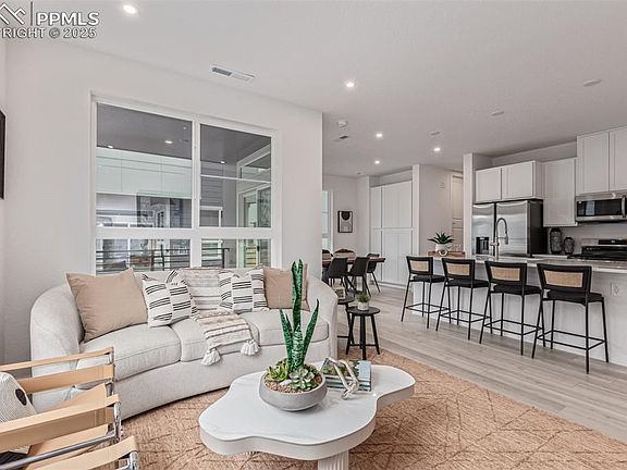 Welcome to low-maintenance living at The Commons at Victory Ridge, where style, comfort, and convenience come together in this beautifully designed three-story home. Upon entering from the front door or the attached two-car garage, you’ll immediately appreciate the versatile and elegant layout. Head upstairs to the main level, where a spacious open-concept great room flows into a well-appointed kitchen featuring a large center island, stainless steel appliances, and a charming dining area. Step directly out onto the oversized patio—perfect for morning coffee or entertaining guests. The upper level offers a thoughtful layout with a generous secondary bedroom and a full bathroom, along with a convenient laundry room. The private primary suite is a true retreat, complete with a roomy walk-in closet and a stylish en-suite bath that includes dual vanities and a walk-in shower. Located in the heart of northern Colorado Springs, The Commons at Victory Ridge offers a low-maintenance lifestyle—landscaping and snow removal are handled for you, so you can spend more time enjoying your home and surroundings. Just minutes from I-25, this community provides easy access to downtown Colorado Springs and the U.S. Air Force Academy. You’re also within walking distance to InterQuest Marketplace, with popular spots like Topgolf, Great Wolf Lodge, Icon Cinema, and a variety of restaurants and shopping options. This is the perfect home for anyone seeking comfort, modern design, and a vibrant, connected location.