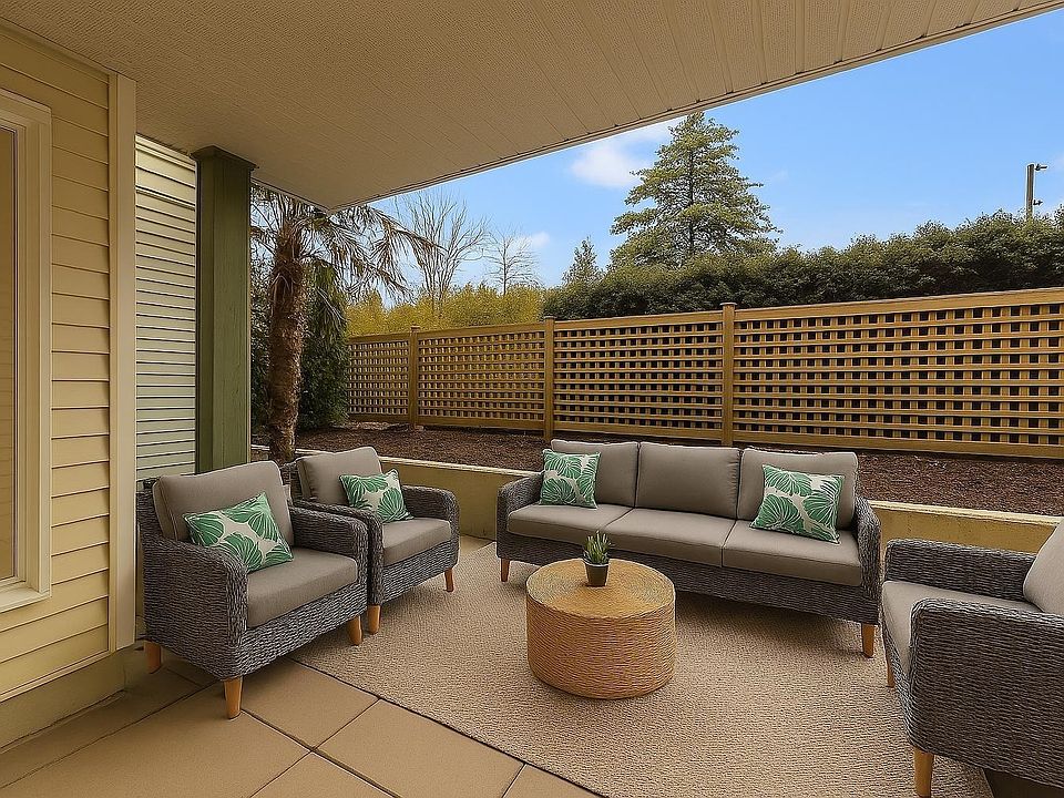 Crestview Court. This freshly painted & tastefully updated 2 bedroom + LRG windowed den (3rd bdrm) feat. 9 ft ceilings & rich mahogany h/w floors throughout. Offering gourmet chef's kitchen w/ stainless appliances, lrg farmhouse sink, pot lights, soft close shaker cabinets & granite countertops w/ breakfast bar. Enjoy a palatial master bedrm w/ full 3-piece ensuite & custom tiled shower. Enjoy your private & covered 115/sqft outdoor patio year round. With over 1,245/sqft of living space, incl. a LRG. in-suite laundry rm, two side by side parking spots & storage locker. Steps away from Skytrain, Central City mall, SFU, Rec Centre, Library, City Hall and Forsythe Elementary school/park are across the street. Pet Friendly.
