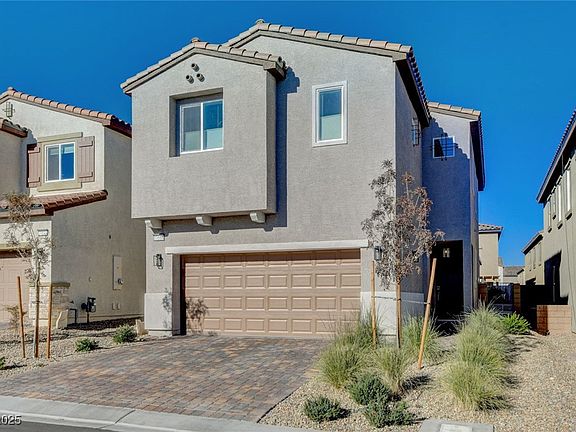 Beautifully upgraded 2-story home in the highly desirable Skye Canyon community! This 3 bedroom, 3 bathroom home offers an open floor plan with living, dining, and kitchen spaces perfect for everyday living and entertaining. The living room features a custom electric fireplace, while the gourmet kitchen includes an island with bar seating, quartz countertops, and Bosch stainless steel appliances. Upstairs is an open loft and a spacious primary suite with a freestanding soaking tub, large walk-in shower, and walk-in closet. A guest bedroom has a built-in office, and the amazing laundry room is fully custom with cabinets, folding counter, and beverage refrigerator. The backyard is beautifully landscaped with a covered patio, pavers, and low-maintenance synthetic grass. Enjoy resort-style community amenities including pool, gym, playgrounds, coffee shop, and multiple parks. Come see your new home today!