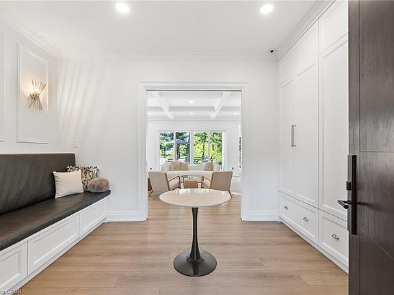 Introducing Bridlewood Estate at 1067 Jerseyville Road, Ancaster where timeless design meets modern indulgence. Crafted by Mikulin Contracting and spanning over 7,600 sq. ft. of professionally designed living space, this residence is a rare blend of architectural elegance and effortless comfort. From the moment you enter, the scale and detail are undeniable. Soaring 10' ceilings, expansive windows framing panoramic views, and finely curated finishes including luxury vinyl plank floors, coffered ceilings, crown moulding, and herringbone floors on the second level that elevate every step. Designed for both intimate family living and grand entertaining, the heart of the home is its chefs kitchen anchored by an oversized island with dual dishwashers, a hidden pantry with a built-in wine and beer fridge, and a Bosch built-in coffee machine for effortless daily indulgence. Every lifestyle is considered. A private office for productivity, a gym and yoga studio with sauna for wellness, an entertainment lounge with a kitchen, and even a children's playroom with its own private deck walkout, ideal as an in-law suite. Retreat upstairs to a primary suite that rivals five-star resorts, complete with heated marble floors, a spa-inspired ensuite, two walk-in closets, wet bar, balcony, and a private terrace with hot tub. Guests are equally indulged with their own en suite quarters and dry bar coffee station. A dedicated second-floor laundry room with dual washers and dryers ensures daily living is as seamless as it is luxurious. Outdoors, manicured landscaping frames a wraparound patio perfect for all-season entertaining. Surrounded by a country paradise, you'll often spot wild turkeys and beautiful horses grazing, and the sunsets here are simply spectacular. Additional luxuries include a heated and cooled garage with soaring 16'4" ceilings, a bar area, a golf simulator, parking spots total for up to 18 vehicles, and a state-of-the-art water system valued at over $20,000.