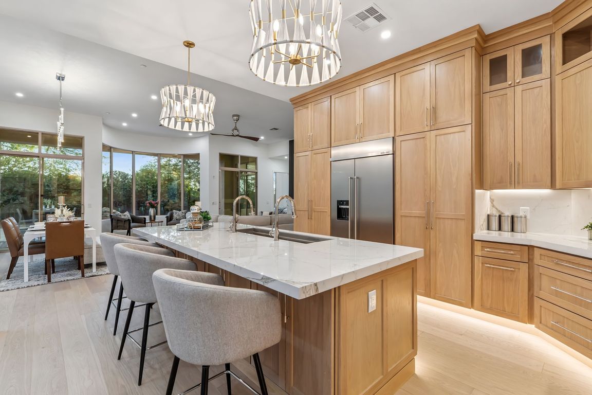 Travertine paversWide-plank white oak flooringGlass-enclosed wine wallCustom closetPorcelain countersPool with water featureUnder-cabinet lighting