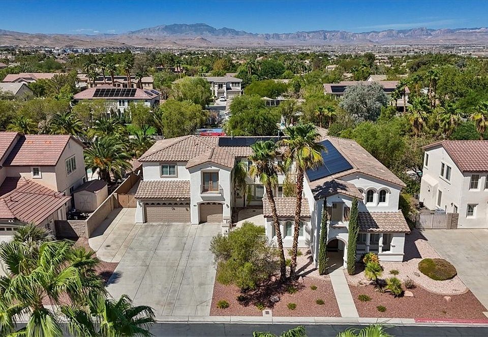 Nestled within the desirable San Rafael gated community, this beautiful estate offers the perfect blend of style and comfort. With 5 bedrooms and 4.5 baths, the home is designed for both functionality and entertainment. The floor plan includes a downstairs bedroom with ensuite bath, a downstairs private den/office, an upstairs great room, and a primary retreat featuring a spacious ensuite, walk-in closet and private balcony that overlooks the sparkling pool. The beautiful kitchen features granite countertops, an eat-in island with cooktop, and relaxing views of the spa-like back yard. Other features include plantation shutters, crown molding, RV parking and a detached casita. The pool and spa along with an expansive covered gazebo are perfect for entertaining. Located just minutes from the airport, the Las Vegas strip, shopping, dining, and schools, this property combines convenience and lifestyle. Come see all this estate has to offer!