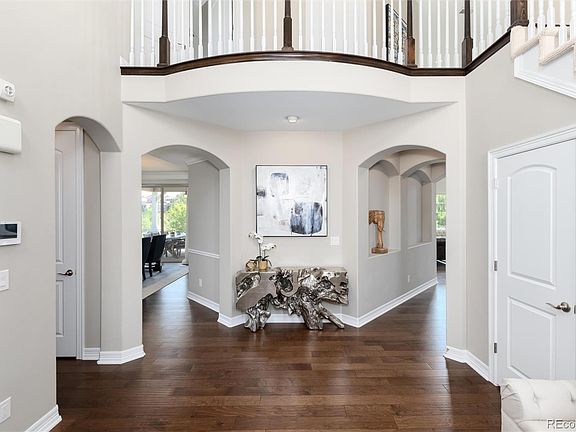 This one is hard to beat! This Toll Brothers semi-custom home has the ideal location in gated BackCountry in Highlands Ranch. From the mountain, downtown, city and park views to the interior design elements of this home, you will be awed from the moment you enter. The interior gives off a vibe of casual elegance, embracing a great blend of comfort + upscale ambiance. The two-story foyer welcomes you into the home with a beautifully crafted, curved staircase to the upper level. The Great Room features volume ceilings, custom fireplace, surround sound, a secondary staircase to the upper level loft, and many windows to the oversized, private backyard that backs and sides to open space. An open kitchen with high-end appliances provides a great space for gathering and entertaining. The main level also features a breakfast room with access to the outdoor lanai, a formal dining room, comfortable guest bedroom with ensuite, mudroom, incredible laundry room, a powder bath and a dedicated office (which qualifies as an additional main floor bedroom with closet). Upstairs, the primary bedroom suite is grand in size and features a large closet, a great bath, a fantastic sitting area with amazing city, downtown and mountain views, extra storage space and a built-in coffee bar area. Also, upstairs, Bedrooms 2 + 3 feature exquisite mountain and park views, large closets and a shared, updated bath. The basement is where entertaining becomes front and center. The secondary kitchen has quartz countertops and great appliances, a family room, gaming space, full workout room, additional bedroom (staged as a play area), full bathroom and many separate storage areas. The outdoor living offers the best of Colorado lifestyle. There is the spacious lanai for outdoor cooking and dining, hot tub, generous fenced yard, mature, professional landscaping, firepit patio, and space to play. BackCountry offers resort-style living, clubhouse, access to trails, parks, ponds, coffee house and pools.
