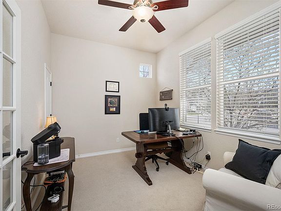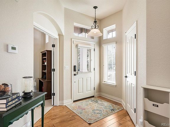 This gorgeous 2 story exudes true pride of ownership. Boasting four bedrooms and three bathrooms, this home pulls out all the stops with an open-concept layout and soaring 10-foot ceilings. The ample windows frame the natural light perfectly, painting the interior with a warm glow, while the cozy gas fireplace and mantle create an intimate ambiance. The beautiful hardwood floors throughout the main level add to the regal feel of the home. A private office or bedroom sits quietly on the main floor, adorned with glass French doors and is located by a powder room. The living area is adorned with a large archway, built-in nooks, and extends to the eat-in dining room, complete with a sliding door that opens up to the stamped concrete patio and tree-lined backyard. A second archway leads to a stylish kitchen, accentuated by bar top seating, a kitchen island, granite countertops, and upgraded stainless steel appliances, as well as 42-inch maple cabinets. Upstairs, the primary bedroom is highlighted by a gorgeous tray ceiling, a walk-in closet with built-ins, and a luxurious 5-piece bath. The spacious secondary bedrooms offer ample storage and built-in shelving and drawers, accompanied by ceiling fans and a full bath with a double vanity. A loft area is perfect for an office or extra living space. Hard surface flooring throughout the upper floor. The 3-car tandem garage with an epoxy floor, built-in storage, and a sink adds to the convenience of this home. Plenty of room to expand in the unfinished basement. Firelight is a perfect location that is less than five minutes away from Firelight Park, Red Tail Park, Mountain Ridge Middle, and Mountain Vista High School, this home is located in the award-winning Douglas County Schools with access to acres of Backcountry Wilderness and four state-of-the-art recreation centers, featuring pools, pickleball courts, climbing walls, and workout facilities. This one won't last!