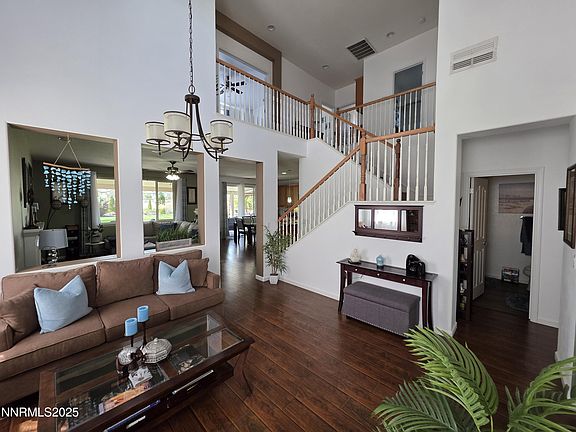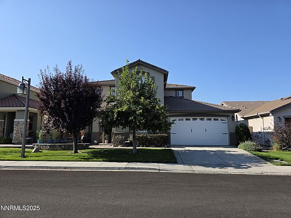Nestled in the desirable Willow Creek Villages at Damonte Ranch, this property presents a unique blend of natural beauty and great views of Mount Rose, convenient access to schools, shopping centers and recreational facilities, and is just short drive to Lake Tahoe. This 4-bedroom, 3-bath, floor plan boasts a well-designed floor plan. The formal living room features high ceilings, while the spacious family room showcases a cozy fireplace and seamlessly integrates with the dining area and kitchen, complete with granite countertops, stainless steel appliances and modern lighting fixtures. The master suite offers a great view of Mount Rose, a relaxing garden tub, shower stall, dual sinks, and master closet, accompanied by two additional bedrooms upstairs. The upstairs hallway and high ceiling create an airy, open atmosphere, providing an expansive view of the formal living area. An additional guest bedroom and full bath are conveniently located downstairs. Additional features include three-car tandem garage with one serving as a versatile man cave for enthusiasts. The serene backyard boasts a covered patio, offering unobstructed views of Damonte Ranch Park, walking trails, and Mount Rose, fully landscaped, pavers, and one additional gazebo. The front of the residence features a paved courtyard seating area, perfect for relaxation and enjoying the surrounding natural beauty.