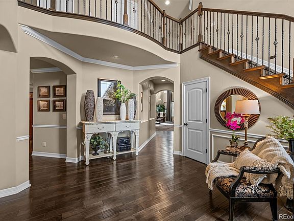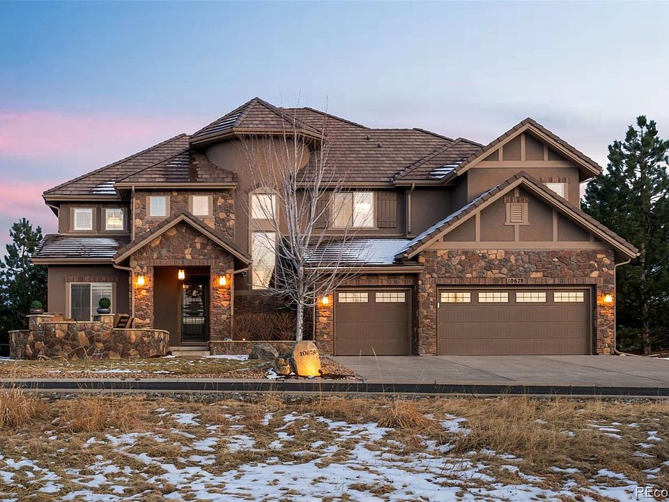 Welcome to 10678 Featherwalk Way in the highly sought-after Backcountry community of Highlands Ranch! This stunning home offers 5 bedrooms, 6 bathrooms, and over 6,000 beautifully finished square feet. Perfectly positioned on a premium cul-de-sac lot with breathtaking mountain views from the front, this property is surrounded by open space, making it an ideal place for outdoor fun and relaxation. The backyard is a true retreat, featuring a covered patio with a built-in fireplace, a gas grill, a bocce ball court, and a hot tub. A water feature and mature trees create a private oasis for entertaining or unwinding. The front yard is equally inviting with a cozy fire pit and open space to explore. Inside, you'll find a grand foyer and soaring ceilings that lead to a spacious great room with a gas fireplace and floor to ceiling windows, seamlessly connecting to a chef’s kitchen with an oversized island, double ovens, and a gas range. The main level also includes a bedroom with ensuite bathroom, formal dining room, an eat-in kitchen area, and a dedicated office. The luxurious primary suite features its own double-sided fireplace, sitting area, a private balcony, and a spa-like bathroom. Two additional bedrooms with ensuite bathrooms on the upper floor. The finished basement offers endless fun with a bar, theatre system, room for a pool table, game area, and a workout space. Backcountry is a gated community known for its exceptional amenities, including the Sundial House with a pool, fitness center, bar/restaurant, and amphitheater for live summer music. With miles of scenic trails and engaging community activities, this neighborhood offers a lifestyle like no other. Meticulously cared for and move-in ready, this home is a must-see! Schedule your showing today to experience all it has to offer.
