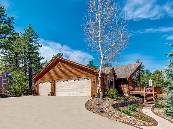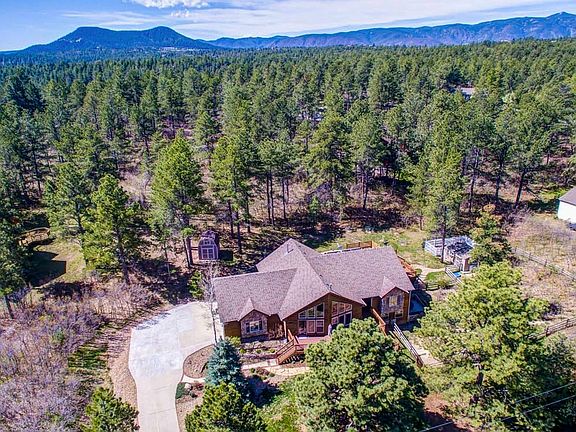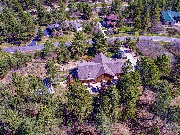 Magnificent ranch w/walkout bsmt on almost a full acre!! Open concept floor plan w/lots of windows and vaulted ceilings for a bright and sunny living space! Spacious kitchen w/breakfast bar, granite counters, hickory cabinets w/crown molding, command center and SS appliances. Family room offers built-in entertainment space and surround sound. The expansive master suite features a private fireplace, deck access and 5pc bath w/jetted tub! Main level also features 2 secondary beds, laundry rm w/built-ins and sink, and exercise rm w/large mirror and flex space w/custom built shelving/lighting. Bsmt rec rm for entertaining w/wet bar, pre-wired theatre, and 4th bed w/French doors and 3/4 guest bath. Stunning, expansive exterior w/front and back decks, stamped concrete patio w/awning, greenhouse and 2 Tuff sheds, 1 offering heat and electricity! Ice melting system on the roof. Near Bear Dance Golf Club w/easy access to I-25 for commuting! This is a must see home!