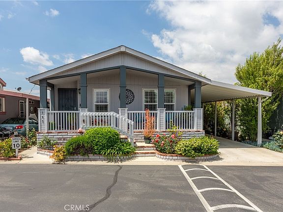 This stunning mobile home is located on one of the most desirable lots in the Royal Oak Park 55+ quiet and small community in Los Alamitos.  It features an inviting front porch surrounded by mature foliage. This home also offers a side and back yard with a fabulous garden, roses with lemon, lime and kumquat trees.