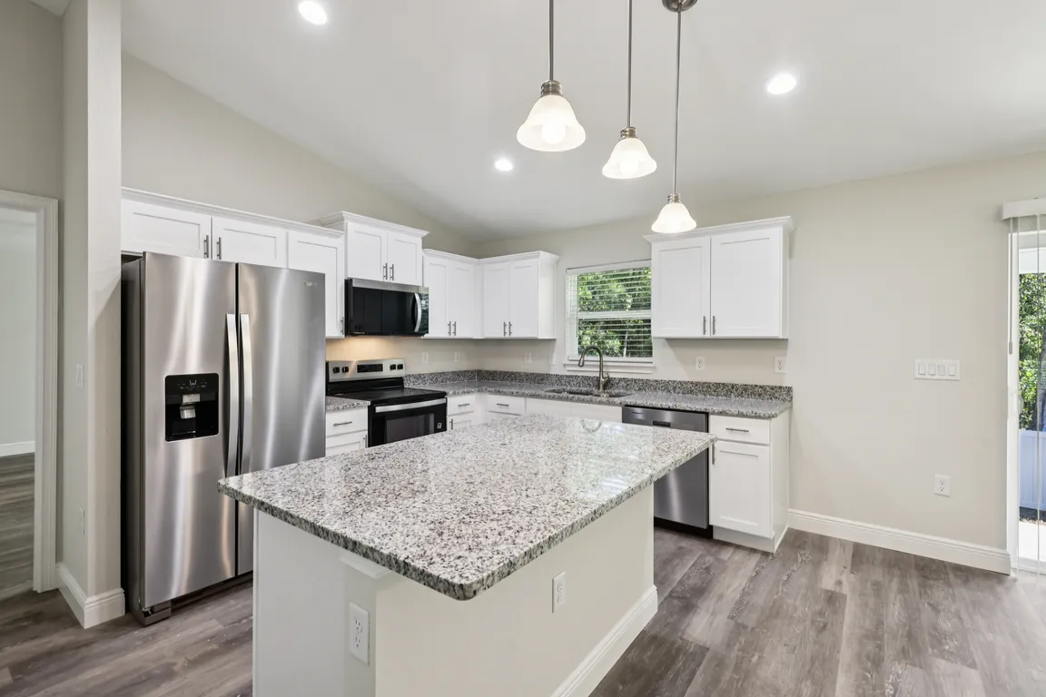 Oversized islandEn suite bathroomElegant granite countertopsModern luxurySplit floor planLarge kitchenDual vanities