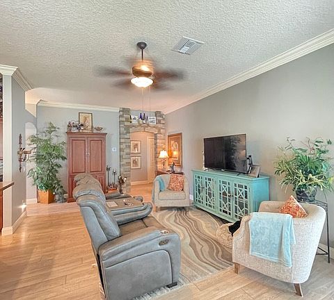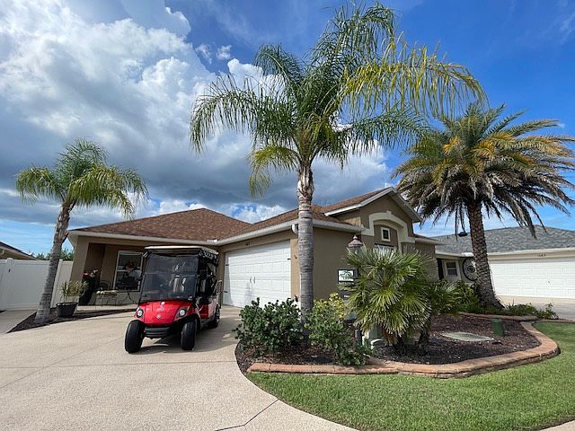 The kitchen boasts stainless steel appliances, and additional conveniences include an indoor laundry room. This pet-friendly home also comes with a gas golf cart, perfect for exploring all that The Villages has to offer.