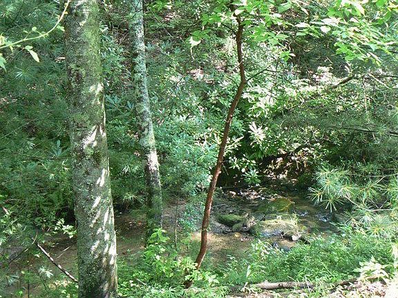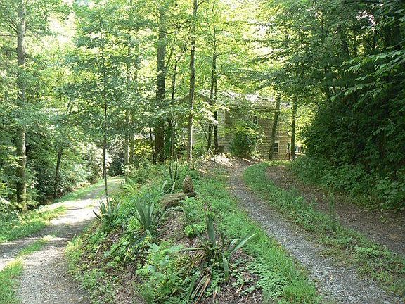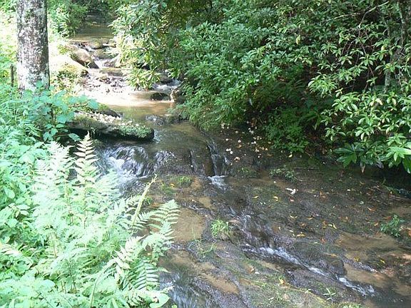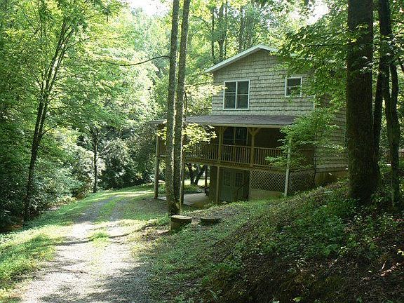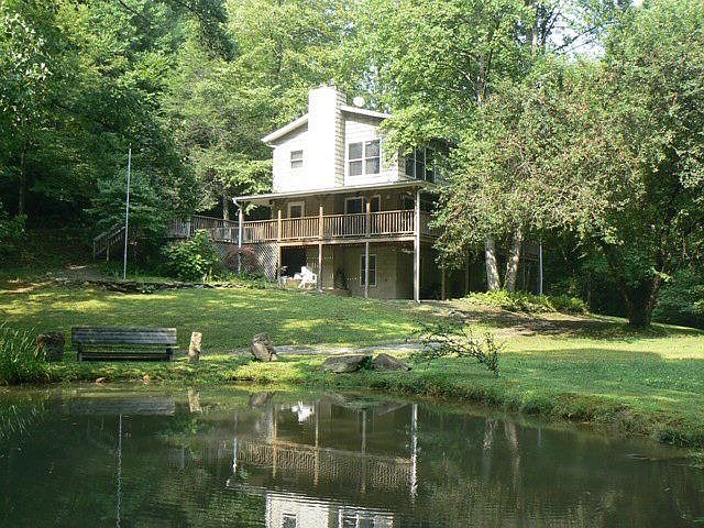 You will find this gorgeous 2 story w/basement (2 BR 3 baths 3 fireplaces) cottage located on 1.368+/- acres nestled in the woods (at the end of the road)and adjoined by Stone Mountain State Park. House has beautiful wood thru out the 1st and 2nd floors. Enjoy relaxing on your covered porches listening to a babbling creek and overlooking your own pond. Come view today!