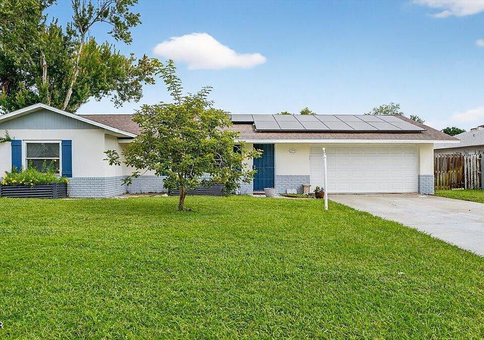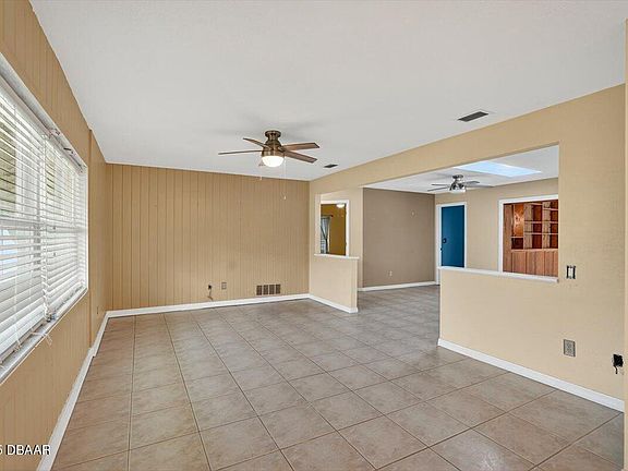 This Port Orange Pool Home is ready for a new owner to love! 3 bedroom, 2 bathroom home is conveniently located in Kingswood Subdivision off Clyde Morris Blvd, close to shopping, groceries and restaurants! This open floor plan has a formal living room that seamlessly opens to the dining area and kitchen. A skylight in the dining area offers a warm flow of sunshine. Kitchen has a sizeable pantry, breakfast bar and plenty of cabinets for storage. Big bonus is the family room with built in shelving and cabinets along one wall and a wood burning brick fireplace. You will also find a wet bar area with a sink, great for entertaining. Open the sliding glass doors that lead to the sparkling, screened in pool where you can relax with a cold beverage and cool off. The primary bedroom overlooks the backyard and has plenty of room for a king-sized bed. Primary bathroom has a walk-in shower and single sink vanity. Guest bedrooms share a guest bathroom with a vintage blue tub! This home is very energy efficient with solar panels installed in 2022 and new windows in 2015. Other upgrades include a roof in 2015, HVAC 2018, and water heater 2005 and wood fence in 2016.