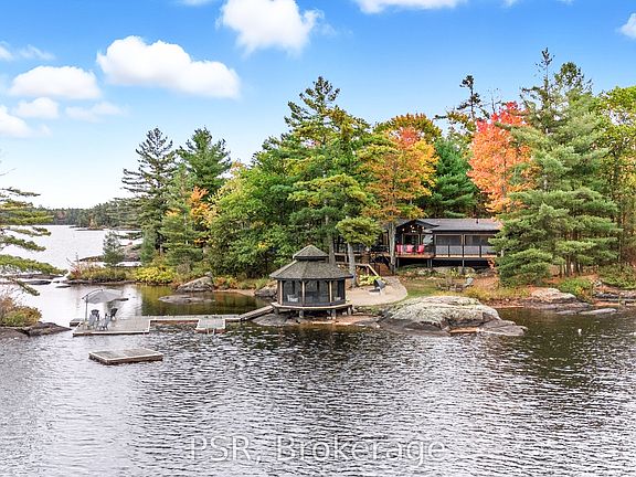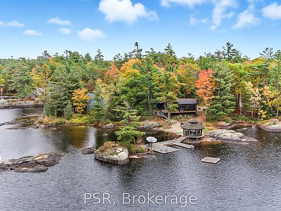 Welcome to Kahshe Lake Cottage Retreat at 1069 White Eagle Road, a refined lakeside residence offering exceptional four-season living on the tranquil shores of Kahshe Lake in Gravenhurst. Perfectly positioned in coveted South Muskoka, this retreat offers the ideal balance of peaceful seclusion and year-round convenience a quick drive from the GTA, yet surrounded by the natural beauty, pristine waters, and timeless charm that define Muskoka living. Set on a beautifully level one-acre property with 300 feet of private sandy waterfront and a natural beach area, this captivating retreat blends classic cottage character with modern comfort and understated elegance. The main cottage features a bright, open-concept layout designed to showcase panoramic lake views through expansive windows that fill the space with natural light. With six bedrooms and three bathrooms in total, including a private guest suite above the detached garage with two bedrooms and a 3-piece bath, the property provides exceptional flexibility for hosting family and friends in comfort and style. Outdoors, a private U-shaped dock invites days spent boating, swimming, or relaxing along the sandy shoreline. A charming gazebo by the water offers a peaceful morning retreat, while evenings come alive around the fire pit beneath the stars. The flat, park-like grounds ensure effortless access to the lake and ample room for recreation, entertaining, or quiet reflection. The detached garage extends the enjoyment with a games area featuring a ping pong table and generous storage for seasonal equipment and lake essentials. Whether envisioned as a year-round residence or a luxurious family getaway, this South Muskoka retreat embodies the essence of refined cottage living, where tranquillity, accessibility, and natural beauty meet just a short drive from city life.