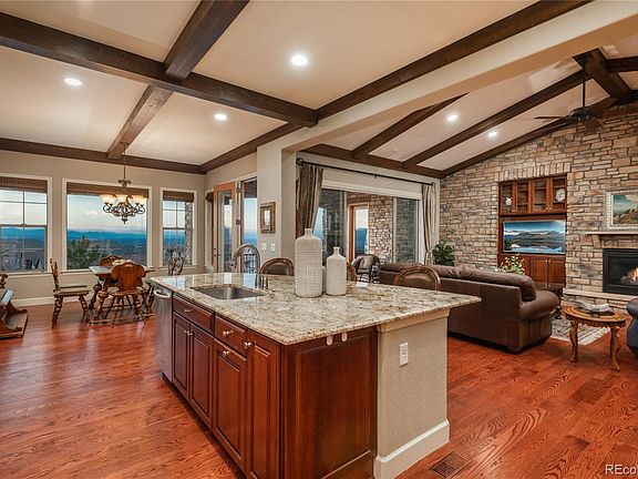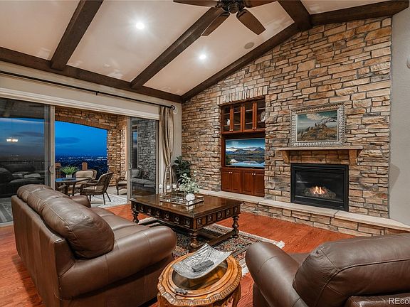 This charming ranch-style home is nestled at the end of a quiet cul-de-sac, offering breathtaking views. As soon as you step inside, you'll be greeted by stunning mountain views and an abundance of natural light. The main level is perfect for entertaining, featuring a spacious kitchen with a large island that seamlessly flows into the expansive great room, complete with a stone fireplace. The main floor also includes a vaulted-ceiling office with built-in bookshelves, a primary bedroom with mountain views, a secondary bedroom with an en-suite bathroom, and a formal dining area. Down the open spiral staircase, the lower level offers a cozy great room with a fireplace and bar area, along with a bonus room ideal for a second home office. Additionally, you'll find two more bedrooms and a full bathroom. The low-maintenance outdoor space features a turf backyard surrounded by beautiful plants, trees, and flowers. Relish in spectacular Colorado sunsets right from your home! Don’t miss the opportunity to make it yours! Love the lifestyle of Backcountry, with resort style pools, work-out facility, trails, parks, ponds and so much more.