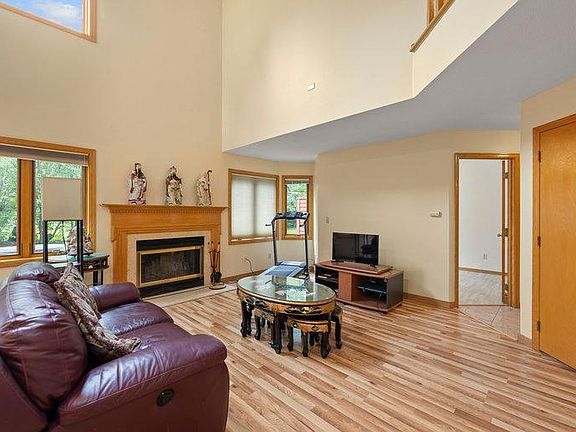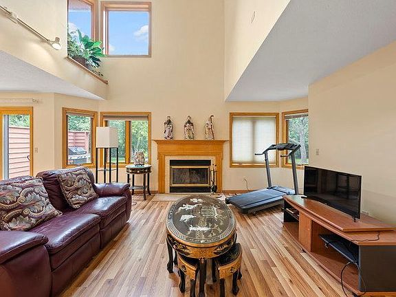 Swarovski crystal chandelier. The living room, complete with a fireplace, provides a cozy space to relax