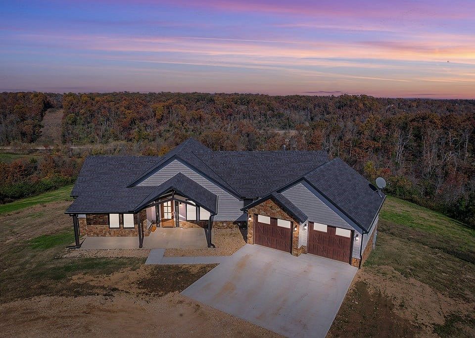 Nestled atop a serene hill on 36.92 majestic acres where deer roam and seasonal lake vistas appear, this 2023 craftsman-style home blends thoughtful design with everyday comfort. Tall ceilings and expansive windows fill the main living area with natural light, centered around a beautifully appointed kitchen. The main level offers three tranquil bedrooms and two full baths for easy, refined living. Downstairs, the walk-out lower level provides a welcoming setup for extended family or guests, complete with a full kitchen, separate laundry, a stylish bath and two bonus rooms ideal for a studio or extra-bedroom use. Located in Lowell, the home is approximately a 10–15 minute drive to I-49 and positioned near the Benton/Washington County line, offering both privacy and convenience. Immerse yourself in nature and embrace a lifestyle of seclusion and comfort.