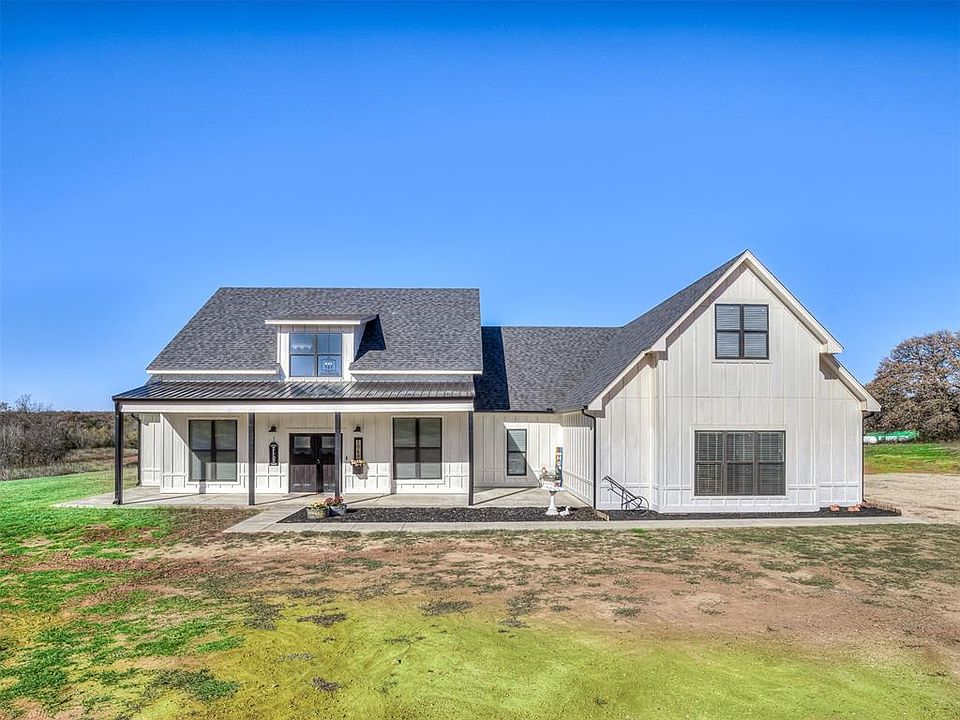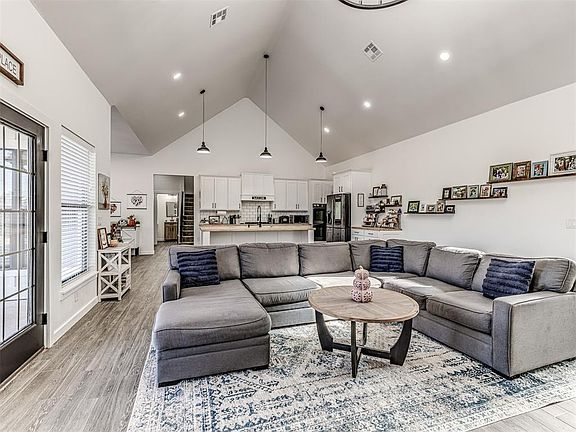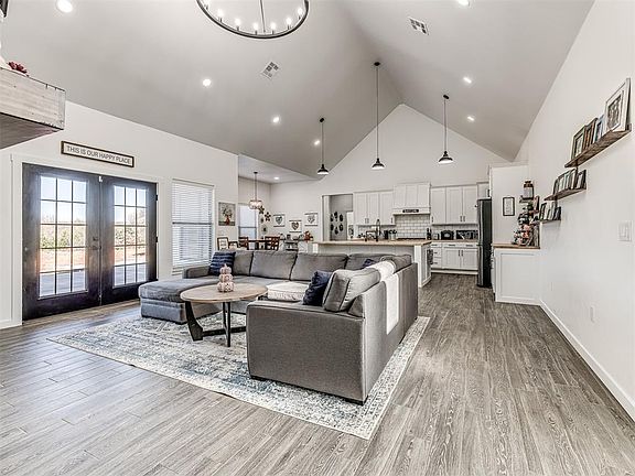 Stunning modern farmhouse gleams luxurious, elegant charm and rests on 5, yes FIVE, gorgeous acres of private and peaceful land only 15 minutes from Norman. This beautiful home has five bedrooms and an office, as well as 2 1/2 bathrooms, providing plenty of space for you and your family. Enter through double doors into this bright, sunbathed, airy and open floorplan, perfect for entertaining. With a spacious living area featuring vaulted ceilings, a cozy fireplace, and a modern mix of textures and fixtures, and opening to a large kitchen that boasts plenty of storage, stainless double-ovens and a gas cooktop, coffee bar and huge pantry, large-basin farm sink, butcher block countertops, and an extensive kitchen island, facing all the entertainment. Master bedroom is large enough for a king bed AND a couch, and the bathroom, oh the bathroom! The master bath boasts a beautiful stand-alone soaking tub, a large, frameless shower, double vanity and a closet as big as a bedroom! Landry room has tons of storage and counter tops, upstairs is an extra-large bedroom that could be used as a theater, play room or guest area, and this home is also equipped with smart-home technology, allowing you to control appliances, amenities, even lights with just a tap on your cell phone. All of this rests on five private and peaceful acres of land, covered in trees and wildlife, turkey and deer, rolling skies, stunning sunrises and sunsets that will take your breath away and a night sky where you can actually see the stars! And still close to restaurants, shopping and amenities, with an easy commute to Norman or OKC.