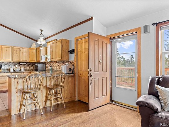 Nestled on a sprawling 2.38-acre flat and usable parcel, this 3-bedroom, 3-bathroom gem in Hilldale Pines offers the perfect blend of privacy and convenience. Step into the heart of the home—the kitchen—where sleek granite countertops and hickory cabinets are paired with a charming banquette seating area, perfect for cozy breakfasts. The living area, featuring high ceilings and rustic wood burning stove, exudes warmth and charm, making this home a cozy retreat year-round. The main level primary suite is a haven of relaxation with its 5-piece bathroom. The basement provides extra space for entertainment, storage, crafting—you name it! Outside, the expansive deck invites you to soak up the sunshine and enjoy the serene Colorado landscape. For gardening enthusiasts, there’s a small greenhouse. The two-car attached garage and paved driveway with ample space for parking work trucks, toys, and vehicles add to the home's practicality. A portable carport alongside a large wood storage shed enhances the property's functionality. With dual access points from both Morrison and Conifer, this home combines convenience with tranquility. Located just 14 minutes from King Soopers in Aspen Park for your grocery needs, 20 minutes from Hwy 285 and C-470, and within 25 minutes of the iconic Red Rocks Amphitheater, you’re always connected yet worlds away from the hustle and bustle. Plus, Denver International Airport is just under an hour away, making travel a breeze. Cherished by the same owners since 1999, this Morrison gem is now ready to be your forever home! With its substantial acreage on a usable lot that's hard to find, good bones, and desirable location, come see this place for yourself—you might just decide to stay for good.