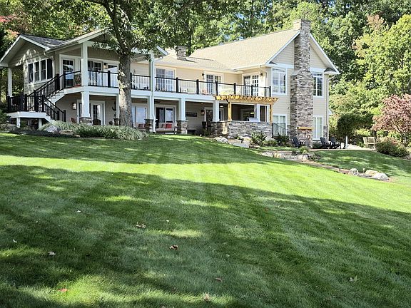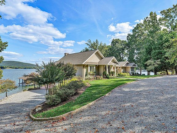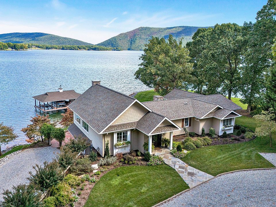 Dreams Come True at Smith Mountain Lake! Experience breathtaking mountain vistas and stunning sunset views from this nearly level point lot. Perfect for entertaining, this home offers abundant space for family and friends to create unforgettable memories.As you approach, you'll feel like you've entered a private park--surrounded by mature trees and a winding driveway that leads to a charming circular drive. A beautifully landscaped stone walkway welcomes you into the home.Inside, the entry foyer opens to a fabulous great room with vaulted ceilings, a stone fireplace, and large windows that frame the ''million-dollar view.'' The gourmet kitchen features a center island overlooking the open dining and living areas, perfect for gatherings.Enjoy the seamless flow to the composite open and covered decks, where panoramic mountain views are spectacular. The main level also includes a Den / Office with Stone Fireplace. There is a spacious primary suite with private deck access, a luxurious bathroom with a tile shower and double granite sinks, a second waterfront bedroom, and a second bathroom. Convenient washer and dryer hookups are located in the hall closet.
