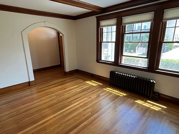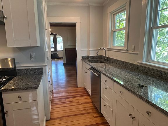 Updated first floor apartment abutting Pequossette park. Beautiful hardwoods and new harvey windows throughout the home, Front entry way w/ coat closet leads to the fireplaced living room. Arched doorways and natural gumwood in both the living room and dining room. Bright sunroom with walls of windows, perfect for an at home office or quiet sitting area overlooking the garden. New, tiled full bath, centered between the two bedrooms with standup shower stall and plenty of lighting. Both bedrooms have decent closet space and two windows. Kitchen has white cabinets, granite countertops and stainless steel appliances. Storage and washer/dryer in the basement. Newer gas furnance and hot water heater. Two car parking w/ one being in the garage. Available 8/1 or 8/15. Landlord pays for water/sewer, landscaping and snow removal for public sidewalk Tenant pays for gas, electric and responsible for snow removal on property. No pets First, security and broker fee (totaling 3 months) required for move in. 1 year lease.