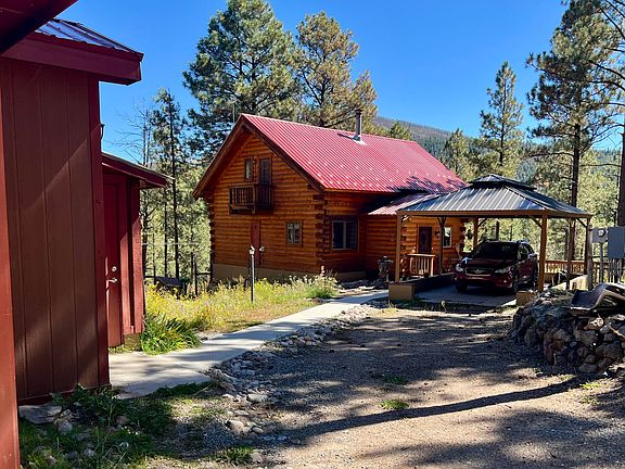 WOW! WOW! WOW! New price on this quality built log home on 1.54 acres. Chalet style log living with log walls and pine floors. Gaze out to the tall pines, birds, and deer w/floor to ceiling windows. Baking kitchen w/island, pantry and lots of cupboards. Lovely loft provides dreamy sleep; listen to the mountain rain! Loft has closet, bath w/shower. Main floor has conventional bedroom with nearby full bath. Downstairs there is a lovely large guest suite with separate room, laundry, full bath, plus large living area with woodstove and outside exit. Two decks, plus gazebo. Fabulous newer 33'x25' garage, shed, plus refrigerated shed. High speed internet. HOA keeps area nice and supplies water and winter road maintenance. About 35 minutes to Los Alamos, the world's prettiest commute