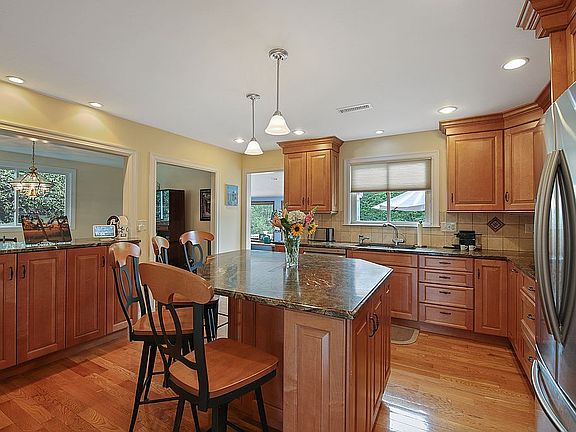 Beautiful, meticulously maintained 3+ bed, 3 full bath residence on a gorgeous tree-lined street. This stunning home boasts gleaming hardwood floors, an open concept living room with a large bow front window & fireplace, a spacious dining room & an updated chef's kitchen with granite counters/island & stainless appliances. There is a generous sunroom/office that gracefully opens to a bi-level deck. The second floor features 2 roomy bedrooms and master suite with a full bath & two closets. There is a lower level family room, great for 4th bedroom or guest suite, with french doors that lead to a private patio. This home abuts conservation land and is near the finest schools, parks, & the best dining and shopping Newton has to offer. Tenant pays oil heat, hot water, electric, water & sewer. Tenant is responsible for snow removal (driveway, sidewalk, walks & stairs) and landlord is responsible for mowing and landscaping. 12+ month lease only. Small dog or cat negotiable. Avail. now