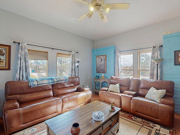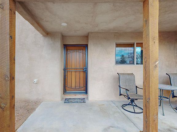 Meticulously maintained Pueblo-style home on a spacious .31 acre lot. Enjoy energy efficiency with solar panels and Trombe passive solar walls. The great room features a wood-burning kiva fireplace with banco finished in venetian plaster. Skylights provide an abundance of natural light. Updated kitchen includes ''leather'' granite counters, roll out shelves in lower cabinets and pantry, newer gas stove and dishwasher. Notable updates also include a new furnace (2020) and thermostat (2023). The primary suite includes two closets, a shower with tile surround, marble counters, a medicine cabinet, and private backyard access. The hall bath showcases a cast iron tub with tile surround and bench, along with a raised bowl sink and medicine cabinet.