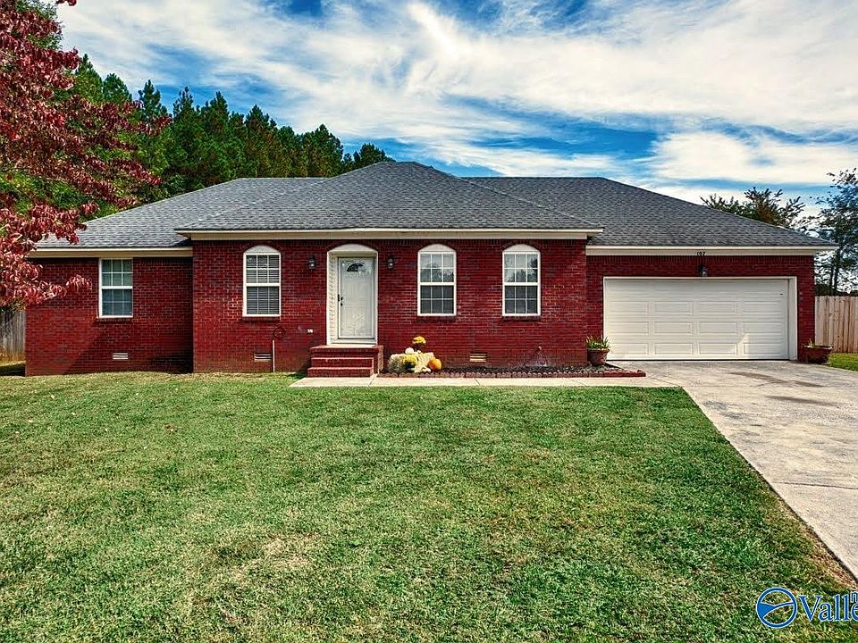 Country living with modern convenience! This 3/4 brick home lives at the end of a cul-de-sac yet has a huge backyard that is bordered by deep woods and feels like a private retreat! Open plan with isolated primary bedroom, efficient kitchen with pantry, custom tile showers, large laundry room, two car garage, and fully fenced yard. Many recent updates including new LVP, tile showers, lighting and paint all around. Kitchen appliances were new in the last 2 years. Well maintained and looking for new owners to continue loving it! If you're looking for 100% financing, this home is in USDA Rural Development target area meaning no down payment!
