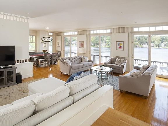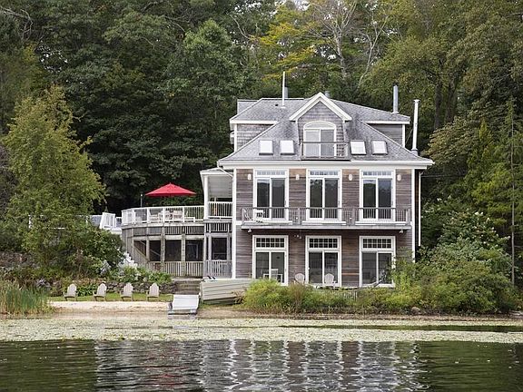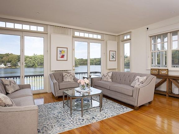 Feel the stress melt away as you enjoy breathtaking views from every angle of this extraordinary waterfront property. Situated on the Dudley Pond peninsula, this light-filled Contemporary boasts an open floor plan, ideal for entertaining. Chef's kitchen, once designed for coffee pioneer George Howell, opens up to a large great room with floor to ceiling windows and expansive wrap around deck. 5 bedrooms includes a master bedroom with fireplace, private balcony, and luxurious walk-in shower. Spacious lower level comes equipped with private entrance and guest suite. Sauna, playroom, cedar closet, and home gym/media room provide ample space to pursue different interests. Screened porch is the perfect place for a hot tub and steps away from a level yard and private beach with dock. Secret garden with Japanese maple provides respite from the hustle and bustle of daily life. This property is sure to make you feel like you're on vacation everyday! 2019-11-04