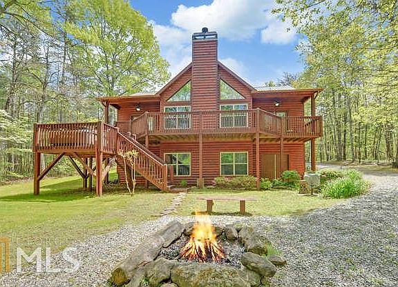 From the fire pit to the hot tub, this cozy cabin is Nestled in the woods with Mountain Views. Just minutes from Helen, enter the pristine Lone Wolf into openness of natural wood to the kitchen with eat in bar overseeing the large LR & Stacked stone wood FP, owners suite comes with deck access, double vanity and oversized tile shower, 2nd bedroom has original built-in furniture for convenience. Terrace level has HVAC in place and stubbed for bath. Over 2 acres of nature welcome deer and wildlife. In 2018, stained and septic pumped. Make this your getaway and/or gain income from renting.