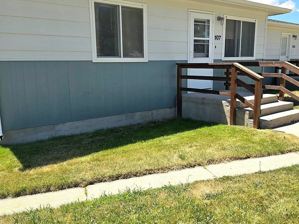 This bright 2-bed, one-bath duplex has forced air gas heat, air conditioning, washer/dryer, single garage, and off-street parking. Beautiful lawn with sprinkler system. Mowing provided.