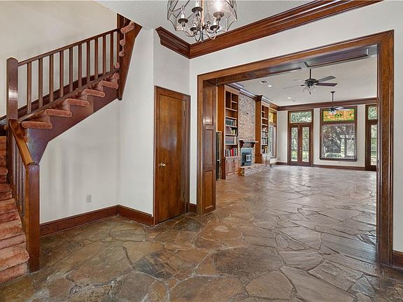 Majestic oak trees frame this 5+ acre estate just beyond the Covington city limits! Brimming with character, the home showcases timeless details like stained glass windows, exposed wood, and classic design throughout. The stately primary suite features its own fireplace, private exterior access, and a spacious ensuite bath. The kitchen, with its large island, flows seamlessly into the dining area, highlighted by another fireplace and walls of windows for natural light.