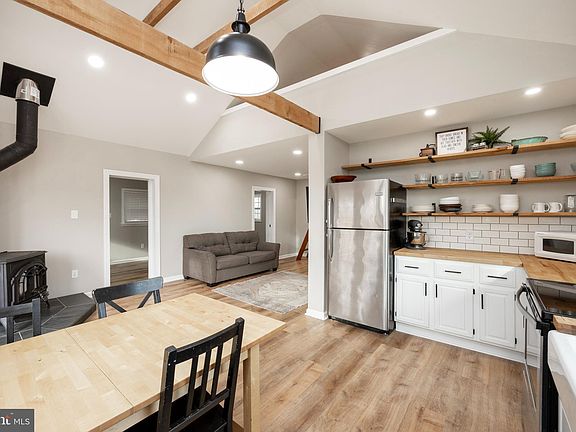 Ready to fall in love? Nestled on a charming back road. Step into a world where compact living meets expansive comfort. At first glance, one might underestimate the dimensions of this humble abode. Yet, as you cross the threshold, prepare to be enchanted by the seamless fusion of functionality and sophistication. You'll adore the kitchen with open shelving, butcher block countertops, a farmhouse sink, tile backsplash, stainless appliances including a range, and a dishwasher. The open-concept design and large windows invite natural light to dance freely across the expanse of the living area, the stunning flooring, and recessed lighting throughout give the home a warm feel. Cathedral ceilings soar overhead, with open beams adding an air of grandeur to the intimate setting. Save on utility bills with the wood stove while adding a cozy touch. Ascend the ladder stairs to discover the true essence of tranquility. The loft is finished for storage or a cozy sleeping area. The enclosed porch area is so versatile, It already is a great mud room with a tile floor and shiplap ceiling plus laundry hookups behind closet doors, you can put an office or play area in this space as well. The primary bedroom has a custom barn door made from the original attic wood for the double closet. 2nd bedroom or office. The picturesque bathroom has a stunning tile floor, a cast tub with tile surround, built-in cabinets, a pretty vanity, and a pocket door! The allure of this tiny haven extends beyond its interior. Step outside onto the 12 x 14 deck, where al fresco dining becomes a summer staple. You will love the yard and custom shed, just the right size for some solitude. This distinctive dwelling stands as a testament to the beauty of simplicity. With its seamless blend of form and function, Whether seeking solace from the chaos of urban life or embarking on a minimalist journey, this refreshing home offers an unparalleled retreat. Close to the Perkiomen Trail, and Spring Mount ski area. New public sewer!
