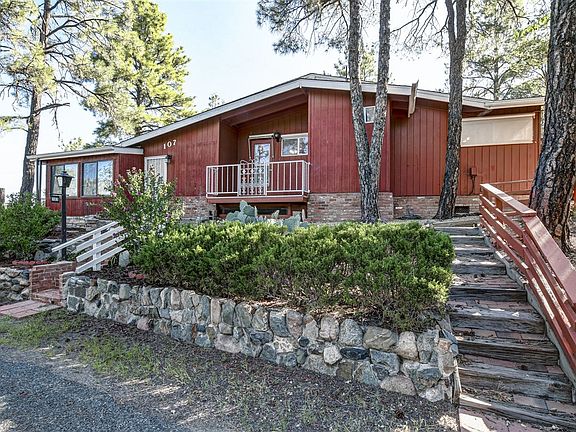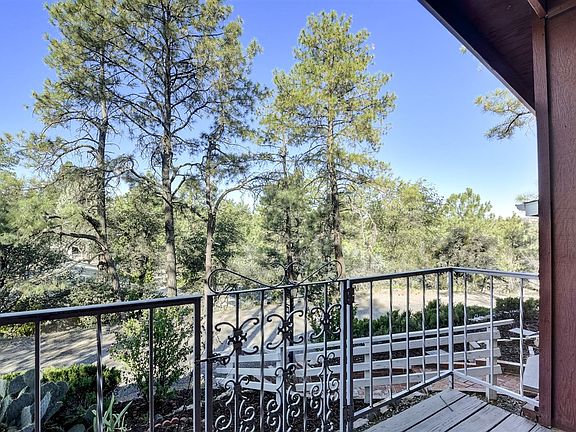 Adorable house nestled in the trees and so close to downtown! Views of P Mountain, Thumb Butte, Granite Mountain, and a view straight down Gurley Street to downtown. This 1960 home has 2 bedrooms, one with an en-suite 3/4 bathroom, a full guest bathroom, an office niche, laundry room with storage closet and a flex room with kitchenette. This room can be a 3rd bedroom, or family room. There is an attached 1 car garage but no interior access from the garage to the house. There is a staircase on both sides of the garage to access the house. The living room and dining room has tiled floors and a wood burning fireplace. There is a sliding door to the brand new patio with iron railings around the perimeter. Tiered landscaped corner lot with lots of pine trees.