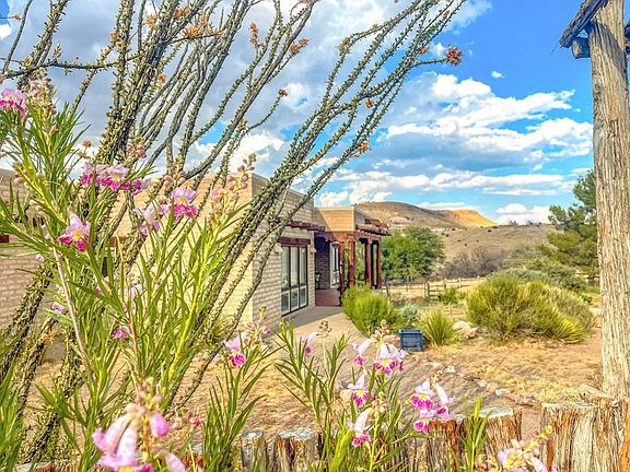 Located a mile high in desirable Limpia Crossing this Southwest style 2,700+sf adobe home on 17+ acres was built by Steve Balardo's Rainbow Adobe. Four bedroom, three bath home thoughtfully situated to maximize privacy and provide unobstructed mountain views from every room. Sequestered 4th BR could be bonus room. Kiva fireplace, brick & Saltillo flooring, in-floor radiant heat and zoned central HVAC. 2-car carport. Deck hot tub, well. Developed private walking trail traverses property.