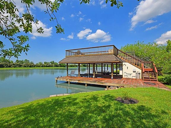 This Beautiful home is located on a unique, water lovers, ski lake community. This small quiet tight nit neighborhood has a security gate entry, a boat launch, and multiple parks and fishing piers. They have annual national ski contest here. You will not find another place like this in Hou. The Lake is stocked w/fish. There is fish food in boat house so eed the fish when you visit. The house has 2 masters. The bright & open kitchen has a big island, breakfast bar, & a great view of the lake. The travertine floors are stunning. The home has wonderful flow & natural light. Large game room up. Do you like entertaining? The screened in pool & outdoor bar/ kitchen is perfect. The boat house come equipped w/ boat lift,& a top deck for more entertaining. 38ft RV garage w/ hook-ups & pass though doors. Owner added sand & made a little beach under shade tree. This home has more character & energy than you can imagine. Fenced in dog run, water softener, sun deck, & much more.