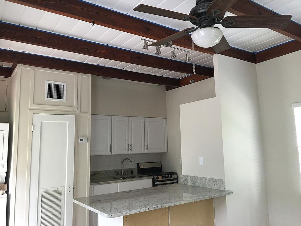 New washer and dryer in unit. Updated travertine-tiled shower room. Modern kitchen with a new granite counter and breakfast bar, stove, new fridge-freezer. One bedroom with a closet. Private patio area with access to a shared courtyard. Private driveway with tandem parking space for 2 cars.