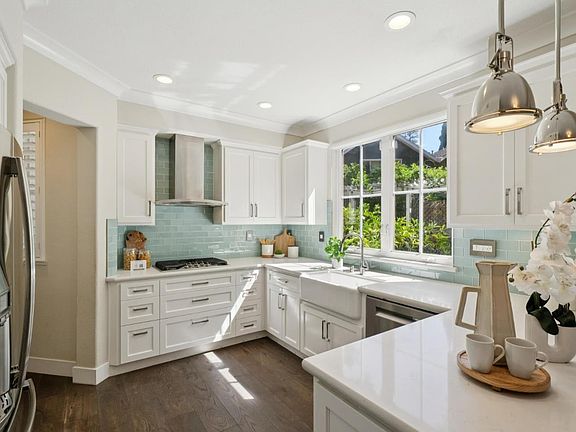 Farmhouse sinkModern finishesOpen kitchenOversized windowsPrimary suiteWhite cabinetryFamily room