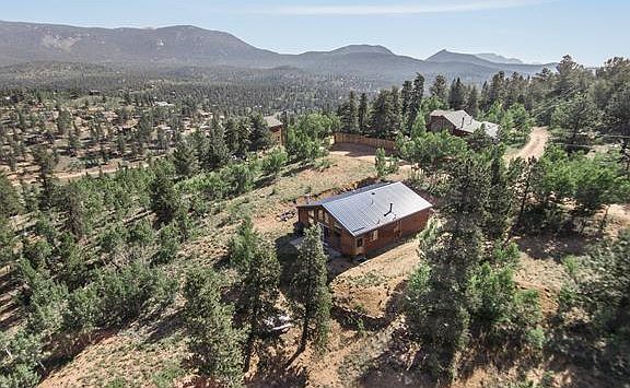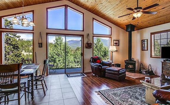 Mountain views for miles and move-in ready! This bright and modern mountain cabin features a wall of windows offering breathtaking views of Pike National Forest. It???s an affordable and cozy all-seasons home or the perfect weekend retreat! The combined kitchen and family room creates a sunny and spacious ???open floor plan??? great room with vaulted ceilings, beautiful tile and hickory hardwood flooring that extends into the bedrooms, hallway and bathroom. The master bedroom features a wood paneled cathedral ceiling and large walk-in closet with shelving organizers and skylight. The second bedroom is large enough to sleep two. The full bath complements this home with a simple clean design and another skylight! Relax on the concrete back patio and enjoy the epic Colorado views or discover the various terraces on this half-acre property ideal for a fire pit or picnic table. Outdoor enthusiasts will love the nearby trails and access to 3 private ponds, regularly stocked for fishing.