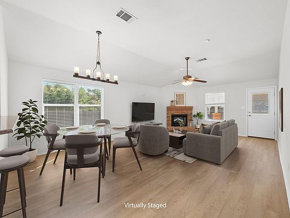 Nestled in a quiet cul-de-sac, this tastefully updated home in the established Churchill Farms community combines timeless comfort with modern upgrades. With a low tax rate and an unbeatable location, this property offers incredible value. Recent updates in 2025 include a new HVAC system, new roof, luxury vinyl plank flooring throughout, fresh interior paint, and beautifully remodeled bathrooms, ensuring peace of mind and move-in readiness. From the curb, a mature shade tree welcomes you, while inside, the open floor plan is flooded with natural light from large windows. The spacious living area centers around a classic brick fireplace, creating a cozy retreat. The kitchen is both stylish and practical with granite countertops, a breakfast bar, ample stained wood cabinetry with pull-out drawers, sleek black-and-white appliances, and a pantry. A charming breakfast nook with a bay window is perfect for casual meals, complemented by a nearby dining area for more formal gatherings. The sizeable primary suite offers a private sanctuary, complete with a modern ensuite bath featuring a dual vanity, soaking tub, frameless glass shower, and a walk-in closet with built-ins. Two additional bedrooms provide versatility for guests, a home office, or hobbies, and share a well-appointed full bath. Step outside to your own backyard oasis featuring an expansive fenced yard with a covered patio and a storage shed, offering endless opportunities for outdoor living and play. As a resident of Churchill Farms, you’ll enjoy access to the neighborhood pool just steps away, along with easy connectivity to Hwy 29, I-35, and TX-130. Not to mention, you are conveniently close to several schools, including Southwestern University and Gateway College Preparatory School, as well as an abundance of nearby shopping, dining, and recreation—making this location truly second to none.This home truly blends charm, function, and convenience—don’t miss the chance to make it yours!