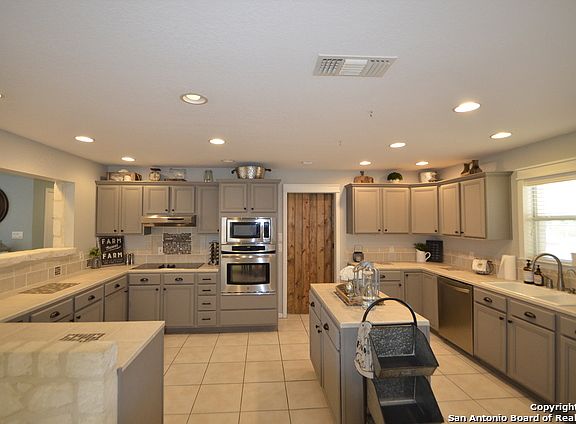 Hard to find close to Boerne 2.8 acres at the end of a cul-de-sac! Fully fenced with little to no restrictions, this Texas Hill Country farmhouse offers a ton of charm! Over 2,600 SF, 3 bedrooms, 2.5 bathrooms, a separate game room that could easily be converted to a 4th bedroom if need be. The updated kitchen is very spacious and offers ample cabinets & countertops, stainless steel appliances, built-in oven & microwave, exposed industrial style shelving, an island and extensive native stone accents. The large pantry has been redone with shiplap walls & open shelving and also serves as the laundry room. The main floor master suite offers a 5 piece bathroom as well as two walk-in closets. Both upstairs guest bedrooms are very large and offer walk-in closets. The guest bathroom upstairs is ideally located between the two bedrooms and offers a double vanity. The spacious game room is located between the guest bedrooms upstairs and has a large walk-in closet already in place. All three upstairs rooms have excellent views of the Texas Hill Country to the north. The property is very usable and offers a variety of options from animals, 4H, horses, hunting and more. There is plenty of room to add a pool in the future for the Texas summers! The two care detached garage is constructed with the same native Hill Country Stone and matches the house perfectly. Boerne schools, 10 minutes to downtown, historic Boerne! Properties like this are hard to find so close to Boerne!