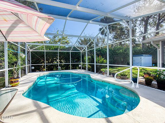 Tucked away on a quiet, established street sits this meticulously maintained 3 bedroom, 2 bath salt water pool home. Located in Hammock Trace and right around the corner from one of Ormond's most beautiful parks, this home has it all. Extensive upgrades include, but aren't limited to NEWER roof, HVAC, hot water heater, fencing, flooring and irrigation system. The eat-in kitchen boasts a large breakfast bar, recess lighting and views of the screened in pool area. Inside laundry with utility sink and pantry located right off of the kitchen for convenience. Formal dining room and spacious great room with two large skylights and additional recess lighting. The bright and sunny screen room has updated wind speed protection windows and a ductless mini-split system providing another area for entertaining. Generous master suite features his/her walk-in closets, walk-in shower, soaking tub and his/her vanity sinks. Watch the world go by from the screened in front porch or.......MORE