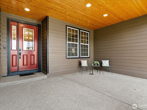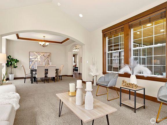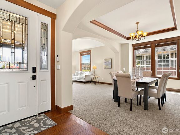 Sensational single-story home on dead-end street. Upgrades include hardwood floors, lighting, trim, solid wood doors, A/C & more. Gourmet kitchen w/ pantry, SS appliances, beverage fridge, granite counters & center island w/ gas cooktop. Layout flows into eating area & living room w/ duel sided gas fireplace facing covered back patio. Formal dining area opens to great room w/ vaulted ceilings & exquisite views of Mt. Rainer. Spacious primary bedroom w/ 5-piece bath featuring soaking tub & walk-in closet. Two additional bedrooms & full bath. Dedicated office. Easy maintenance landscape w/ sprinklers. Fully fenced backyard w/ gas hookup in patio. Attached two car garage & extra off-street parking. Close to downtown shopping & activities.