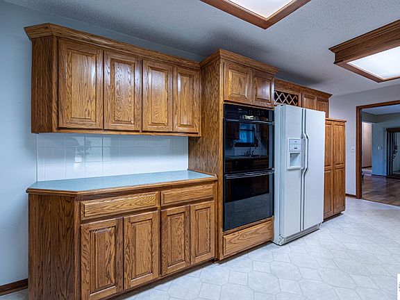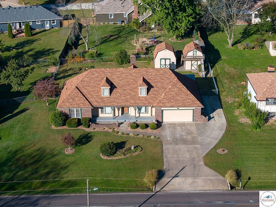 Wood-burning fireplaceFinished basementFront covered porchTwo car attached garageNice sized kitchenStorage shedsOffice space